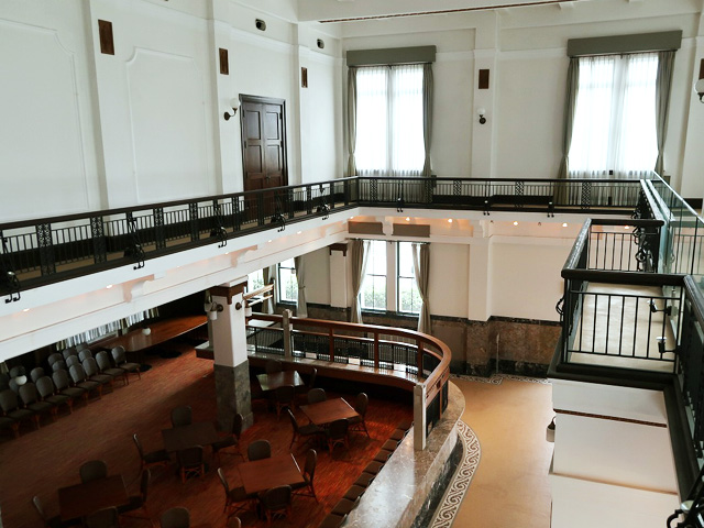 開放感のある吹き抜けのある営業室は、美しい大理石のカウンターがひときわ印象的。カウンターの素材は高知産の暁石(花崗岩)が使用されており、カウンター腰壁には岐阜県大垣市赤坂産の大理石を使用。全国から石材が集められ、贅を尽くした造りとなっている。モザイクタイルの床、天井の漆喰、板壁のラワン材、天窓のステンドグラスなども当時の技術の粋を結集した歴史的遺産である。