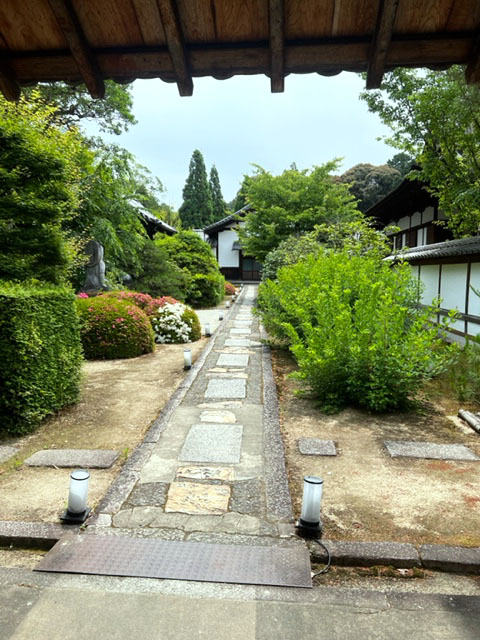 十六枚の花弁をもつ菊花紋の盛砂に佇む灯籠は、皇室縁の寺としての気品を醸しだしており、瞑想の間から見えた中庭庭園にも砂紋と同じ菊花紋の手水鉢がさりげなく配されるなど、皇室縁の寺院であることの矜持が伺える。